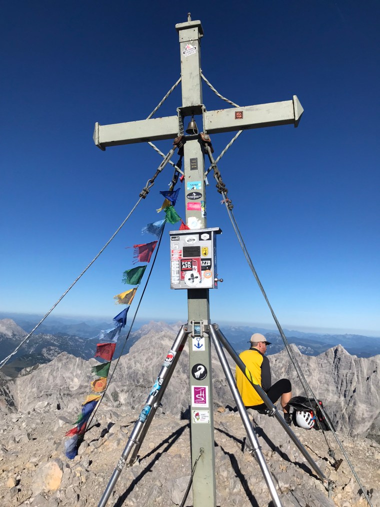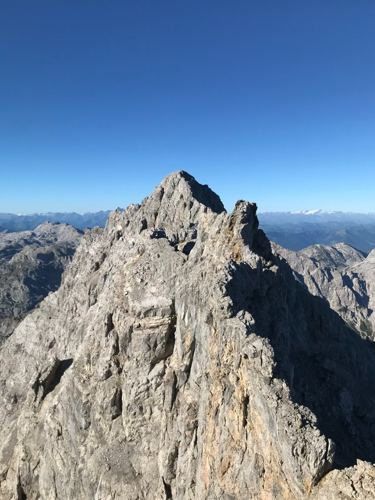 Weiter ging es entlang am Grat zur Südspitze. Hier folgten nun einige Auf- und Abstieg sowie viele, ausgesetzte und nur zum Teil mit Stahlsteilen versicherte Stellen. Mit großer Bravour konnten wir diese Stellen bewältigen. Jedoch waren die Blicke ins Tal immer wieder furchteinflößend und erschreckend – zum Teil geht es über 800 Meter in die Tiefe. Als wir die Südspitze erreichen, sind wir bereits seit knapp 6 Stunden unterwegs. Jedoch lohnte sich das frühe Aufstehen. Uns wurde ein herrlicher Blick ins Steinerne Meer sowie den Hochkalter geboten.