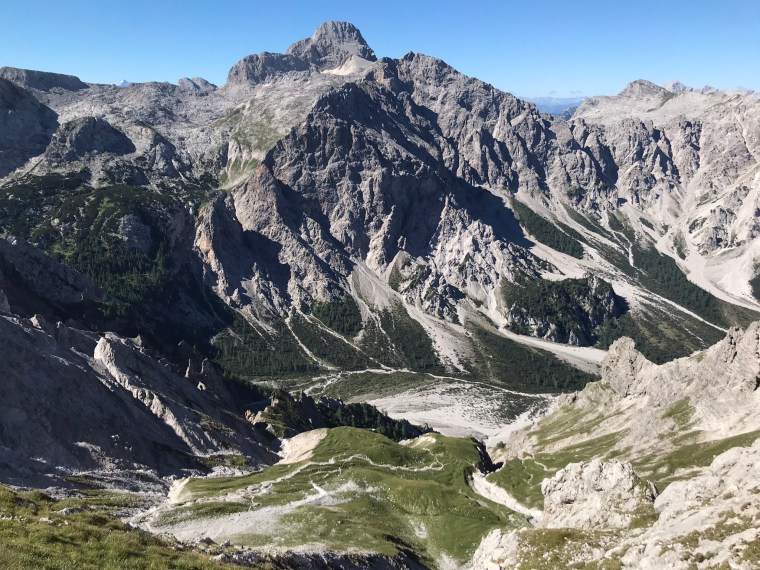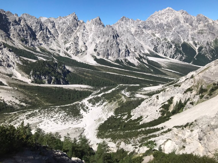 Nach einer erneuten ausgiebigen Pause mit Foto-Session, folgte nun der Abstieg. Es ging über Felsen und Geröll hinab in Richtung Wimbachgries. Dabei waren einige Passagen zum Klettern – man musste sich am Felsen oder Drahtseilen festhalten, um nach unten steigen zu können. Aber man findet auch einige Passagen vor, wo man im schnellen Laufschritt an Höhe verlieren kann. Unten angekommen maschierten wir gen Wiembachgrieshütte.