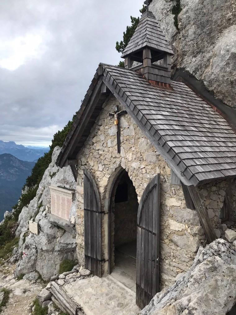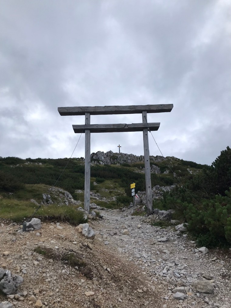 Weiter ging es über einen Wiesenpfad, der uns zum Holzlagerplatz führte. Beladen mit einem Holzscheit für die Hüttenwirte machten wir uns nun auf den letzten Abschnitt der Tour. In Serpentinen führte der Weg durch den Wald bis es zunehmend felsiger wird. Es folgen nun einige seilversicherte Stellen, die man auch als geübter Bergsteiger nicht unterschätzen sollte. Kurz vor dem Gipfelkreuz standen wir einem unerwarteten Weggefährten gegenüber. Eine Gams. Nachdem wir erste Fotos gemacht haben, näherten wir uns dem Tier. Das keinerlei Scheuche zeigte und uns bis auf 2 Meter herantreten ließ, ehe es den gesicherten Weg ins alpine Gelände verließ.